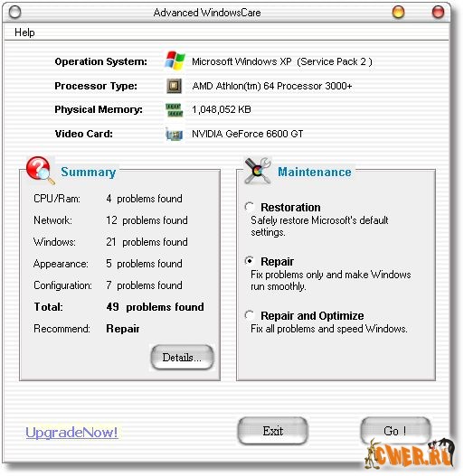 Advanced WindowsCare проводит анализ системы, после чего производит оптимизацию системной конфигурации, в том числе изменяет на оптимальные настройки безопасности, удаляет из системы Spyware и Adware, исправляет ошибки в системном реестре, удаляет временные файлы, оптимизирует параметры интернет-соединения, позволяет управлять автозагружаемыми приложениями