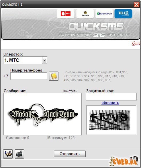 QuickSMS позволяет, не посещая интернет-сайтов сотовых операторов, отправлять SMS абонентам MTC, "Билайна", "Мегафона" и TELE2 за считанные секунды. Программа не требует инсталляции, состоит из одного исполняемого файла и работает в любой версии операционной системы Windows.