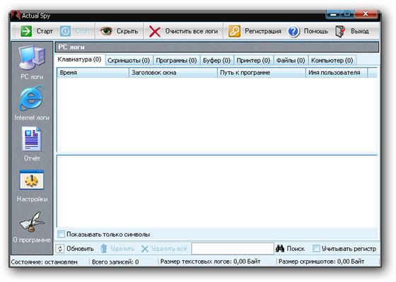 Actual Spy – программа шпион, предназначена для скрытого наблюдения за компьютером, позволяет узнать, что другие делают за компьютером в ваше отсутствие. Контролирует все действия пользователя, позволяет вести наблюдение за событиями в системе: перехватывает все нажатия клавиш (клавиатурный шпион), делает снимки экрана, запоминает запуск и закрытие программ, следит за содержимым буфера обмена, следит за принтером, осуществляет мониторинг файловой системы, отслеживает соединения с интернет, перехватывает посещённые сайты.