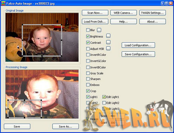 Falco Auto Image - загрузка рисунков форматов BMP, GIF, PNG, JPG, PSD, TIF, TGA, PCD, их пакетная обработка и сохранение результатов в JPG, GIF, PNG, BMP, TIF, TGA. Кроме того, возможна обработка изображений со сканера или камеры.