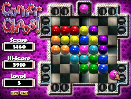 CornerChaos - небольшая логическая игра, в которой нужно скидывать цветные шарики через отверстия по периметру поля так, чтобы они образовывали цепочку из 4-х или более шаров одного цвета (которые исчезают). Игровое поле имеет “наклон”к центру, поэтому шарики всегда стремятся занять положение как можно ближе к центру.