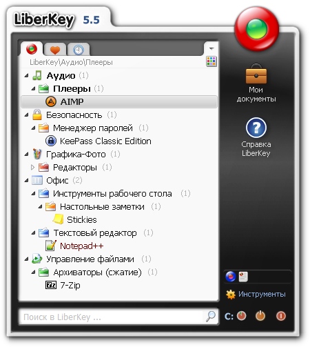 Liberkey - бесплатная программа-контейнер для хранения набора различных портативных приложений и управления ими. Программа может быть установлена как на жестком диске компьютера, так и на любом портативном устройстве. С помощью меню легко управлять приложениями в контейнере и очень просто осуществлять непосредственную загрузку новых приложений из специального онлайн каталога LiberKey (сейчас в этом каталоге имеется уже более 300 портативных бесплатных приложений, причем до 90% из них русифицированы). Большим достоинством программы является наличие механизма, обеспечивающего автоматическое обновление версий как самой программы, так и включенных в контейнер приложений.