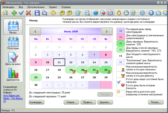 4WomenOnly - простой в использовании ежемесячный индивидуальный календарь менструальных циклов для женщин. Это одна из самых мощных систем для заботы о здоровье женщин. С помощью программы Вы сможете определить дни менструальных циклов, овуляций и дней, безопасных для занятий любовью, дабы избежать нежелательной беременности. Календарь поможет использовать естественный метод контрацепции. Он обозначит дни с большей вероятностью беременности, а также поможет попытаться предсказать пол и дату рождения Вашего будущего ребенка. В календаре есть система напоминаний и ежедневного сбора информации о Вашем состоянии, календарь на полгода, статистика, экспорт возможность распечатки, защита паролем и многое другое (в том числе - русский интерфейс)...