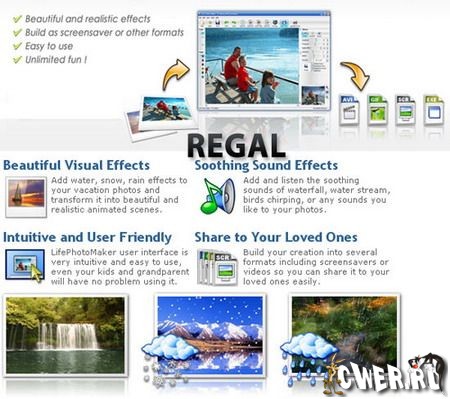 Life Photo Maker позволяет добавлять визуальные и звуковые эффекты к вашим фотографиям. Вы можете легко добавить водяные эффекты, такие как водопад, берег или озеро наложив водяную маску на ваши фото. Вы также можете добавить эффекты снега и дождя, а также до 8 каналов звуковых эффектов. Полученный результат можно сохранить в виде скринсейвера, видео (.avi), или анимированного изображения (.gif).