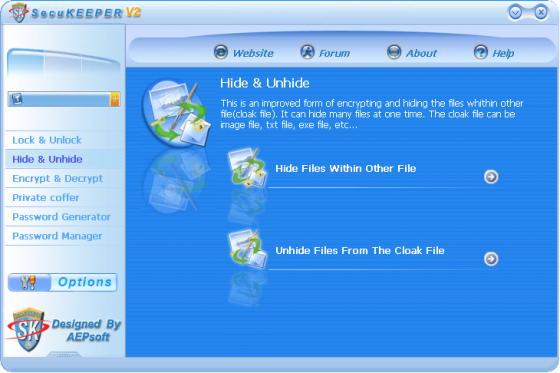 Cтрого скрывает ваши файлы и папки от любопытных глаз. Сегодня Вы не идете, тратя сотни долларов на программное обеспечение кодирования. SecuKEEPER - комплексное программное обеспечение кодирования файлов - Ваш лучший выбор - может охранять все, предлагая четыре типа защиты при помощи кодирования для файлов на различных уровнях безопасности, может быстро блокировать файлы, чтобы запретить доступ, не шифруя их на самом деле, или скрыть блокированные файлы, таким образом, что они становятся невидимыми, может зашифровать файлы и папки, делая их самораспаковывающимися, и таким образом они могут быть открыты на системе, которая не имеет инсталлированного SecuKEEPER.
