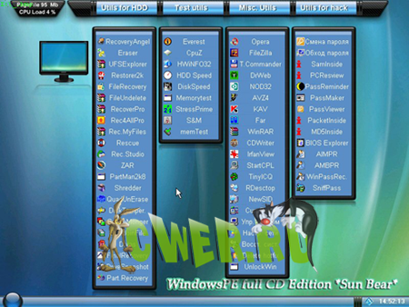 Вышла новая версия WindowsPE full СD Edition (codename "SunBear"). Это операционная система семейства WindowsPE, предназначенная для загрузки с компакт-диска, с помощью которой можно выполнить широчайший спектр задач: резервное копирование, восстановление данных, работа с разделами жесткого диска, проверка на вирусы (за счет загрузки с диска более тщательная проверка, чем если запускать антивирус непосредственно из установленной ОС), диагностика системы, сброс паролей для входа в систему - это далеко не полный список возможностей данной сборки!