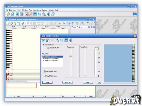 WIDI Music Recognition System Pro - программа для преобразованя цифровых музыкальные записи в команды MIDI. Программа умеет распознавать музыку, содержащую много голосов. То, что раньше требовало нескольких часов работы музыканта, теперь можно сделать почти автоматически за несколько минут. WIDI умеет использовать в качестве исходных записей как WAVE файлы, так и файлы формата mp3, CD-tracks и непосредственно поступающий с микрофона звук без записи его в файл. Распознавание непосредственно поступающего с микрофона или линейного входа звука позволяет на лету преобразовывать звучание не MIDI инструмента (например акустической гитары) в команды MIDI, которые могут тут же быть исполнены любым другим инструментом с помощью MIDI синтезатора. Таким образом, вы можете преобразовывать звук гитары в звук, скажем, скрипки или фортепиано.
