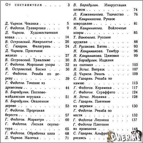 В книге рассказывается о возникновении и развитии народных художественных ремесел в нашей стране, таких, как филигрань, витраж, мозаика, резьба по дереву, игрушки из соломки, чеканка, ткачество, кружево, эмаль и др. В каждом очерке дана технология производства данного вида работ.