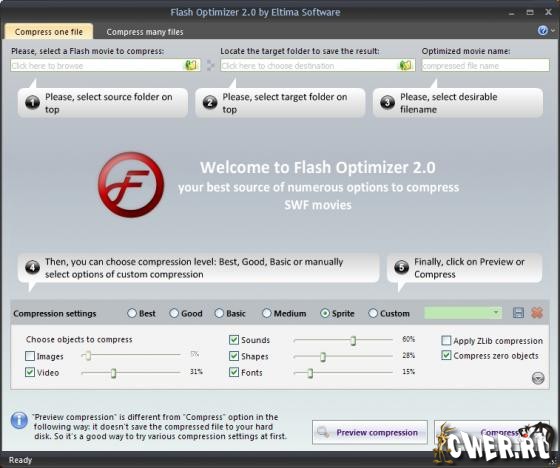 Более 50 различных опций сжатия позволяют полностью контролировать процесс оптимизации и получать отличные результаты без потерь в качестве. Eltima Flash Optimizer предоставляет значительные возможности пользователям Flash, позволяя экономить трафик, время, место на сервере и в конечном итоге деньги!