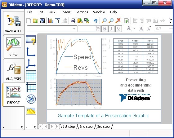 Библиотеки математического анализа включают в себя такие функции, как быстрое преобразование Фурье, цифровые фильтры, аппроксимация, статистика, а также возможность разработки специализированных алгоритмов. Информация, полученная из исходных данных, может быть легко добавлена в профессионально оформленный отчет. Отчеты могут быть представлены в различных форматах: в виде графического файла, в распечатанном виде или в виде готовой HTML страницы. Кроме того, все действия в среде DIAdem могут быть записаны как макрос, который можно редактировать с помощью Visual Basic Script.