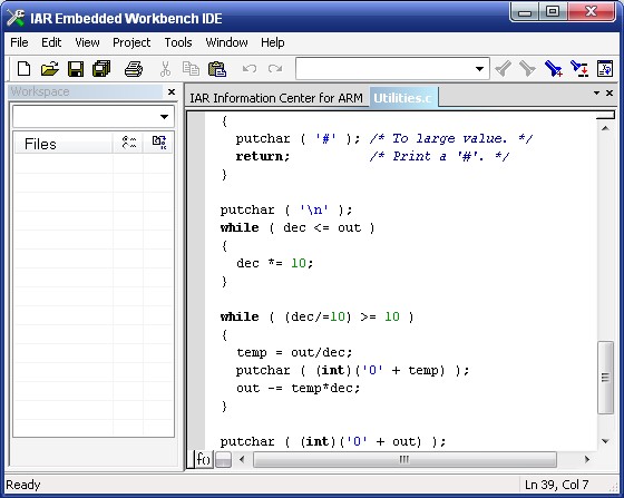 IAR Embedded Workbench for ARM - представляет собой мощную интегрированную среду разработки и отладки программ для микроконтроллеров ARM с помощу языка C, C++ и ассемблера. Она обеспечивает расширенную поддержку устройств ARM и создает очень компактный и эффективный код. В неё входят компилятор языка С и C++, ассемблера, компоновщик и отладчик, при этом возможно взаимодействие с внешними программами. Встроенный редактор специально настроен на синтаксис языка С, а дополнительные утилиты и хорошая встроенная система помощи дополнительно облегчают написание программ.
