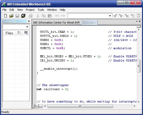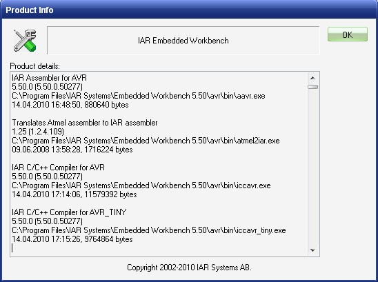 IAR Embedded Workbench for AVR - представляет собой мощную интегрированную среду разработки и отладки программ для микроконтроллеров AVR с помощу языка C, C++ и ассемблера. Она обеспечивает расширенную поддержку устройств AVR и создает очень компактный и эффективный код. В неё входят компилятор языка С и C++, ассемблера, компоновщик и отладчик, при этом возможно взаимодействие с внешними программами типа AVR Studio. Встроенный редактор специально настроен на синтаксис языка С, а дополнительные утилиты и хорошая встроенная система помощи дополнительно облегчают написание программ.