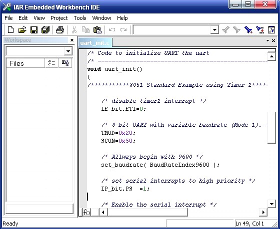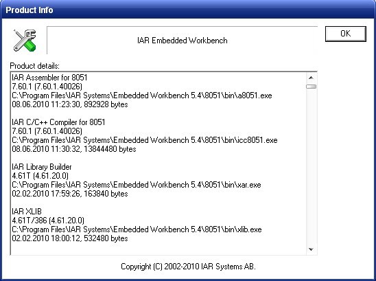 IAR Embedded Workbench for 8051 - представляет собой мощную интегрированную среду разработки и отладки программ для микроконтроллеров 8051 с помощью языка C, C++ и ассемблера. Она обеспечивает расширенную поддержку устройств 8051 и создает очень компактный и эффективный код. В неё входят компилятор языка С и C++, ассемблера, компоновщик и отладчик, при этом возможно взаимодействие с внешними программами. Встроенный редактор специально настроен на синтаксис языка С, а дополнительные утилиты и хорошая встроенная система помощи дополнительно облегчают написание программ.