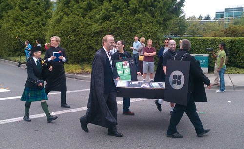 По слухам, ее релиз состоится 11 октября, а выпуск коммуникаторов - в конце октября, хотя в США они могут появиться лишь в ноябре. И вот теперь стало известно, как сотрудники Microsoft очень своеобразно отпраздновали эту важную веху. Они провели в кампусе компании в Редмонде символические похороны BlackBerry и iPhone: процессия людей в траурной одежде несла большие макеты этих устройств, были даже катафалки.