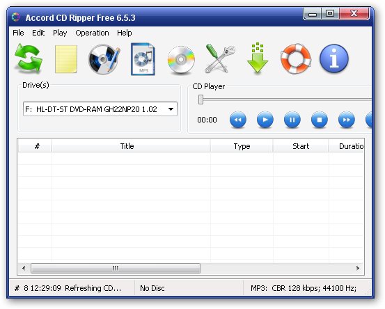 Accord CD Ripper - CD риппер, работающий с несколькими аудио форматами. Преобразовывает треки в wav и mp3 на довольно высокой скорости, которая еще увеличивается в многопроцессорных системах. Программа может искать информацию об альбомах как в локальных, так и в удаленных базах CDDB, эта информация затем может быть отредактирована. Запись мета-данных производится автоматически, есть встроенный CD плеер и многое, многое другое. Интерфейс программы предельно прост и дружественен.
