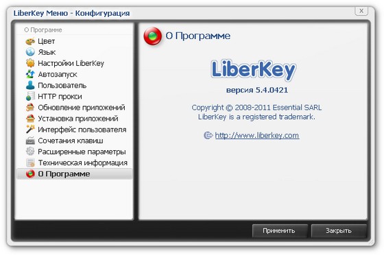 Liberkey - бесплатная программа-контейнер для хранения набора различных портативных приложений и управления ими. Программа может быть установлена как на жестком диске компьютера, так и на любом портативном устройстве. С помощью меню легко управлять приложениями в контейнере и очень просто осуществлять непосредственную загрузку новых приложений из специального онлайн каталога LiberKey (сейчас в этом каталоге имеется уже более 300 портативных бесплатных приложений, причем до 90% из них русифицированы). Большим достоинством программы является наличие механизма, обеспечивающего автоматическое обновление версий как самой программы, так и включенных в контейнер приложений.