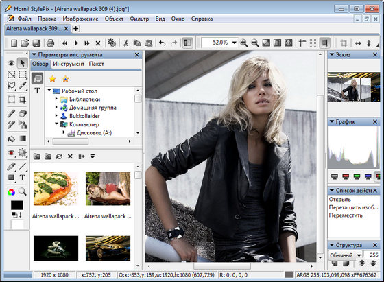 Hornil StylePix - программа, позволяющая ретушировать фотографии, изменять их размер, повернуть, провести цветокоррекцию, наложить текст, сделать фотоколлаж, вырезать, копировать и вставлять фотографии, применять различные фильтры, удалять эффект красных глаз и многое, многое другое. И это бесплатно. Имеет интуитивно понятный пользовательский интерфейс. Он предназначен для легкого и удобного управления отдельными функциями.