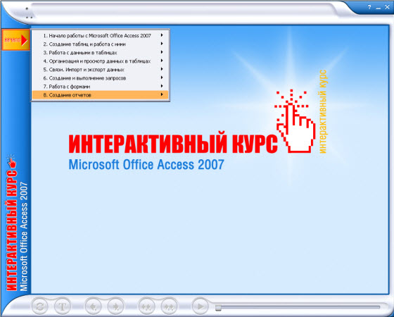 Интерактивный курс по Access 2007 рассчитан на пользователя, впервые приступающего к работе с программой Microsoft Access 2007, а так же это прекрасный шанс повысить свою квалификацию и эффективность работы.