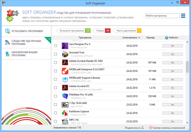 Soft Organizer - утилита для полного удаления программ из системы. Имеет мощную функциональность, позволяющую полностью удалить приложение из системы. Ключевой особенностью программы Soft Organizer является возможность полного удаления программ из системы, построенная на технологии Full Uninstall™. Для этого Soft Organizer отслеживает все изменения, которые происходят в системе во время установки интересующего приложения. В будущем, при необходимости, Soft Organizer воспользуется этими данными и полностью удалит программу из системы.