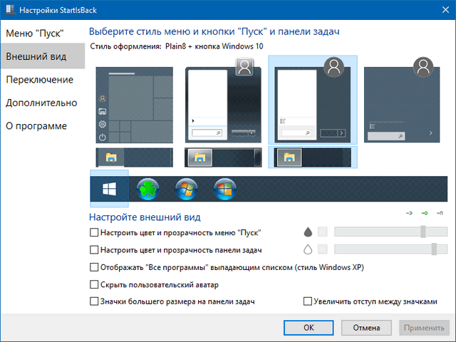 - Позволяет настроить отображение и поведение меню «Пуск» и интерфейса Windows 10: скины, изображение кнопки, активные углы экрана и многое другое.