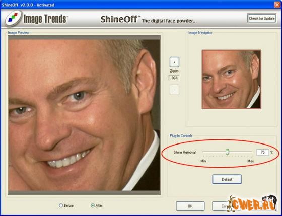 ShineOff 2.02 снабдили новым пользовательским интерфейсом. ShineOff автоматически удаляет блеск с кожи. Холодной белый свет вспышки камеры создает неестественный блеск на коже. ShineOff автоматически придает этим областям кожи и лица ях мягкий и натуральный вид . И в то же время технология позволяет не удалять блеск с губ, белизну зубов и склер глаз. Его можно применять к отдельным изображениям или в сочетании с другими Image Trends плагинами в Photoshop, а так же в пакетном режиме. Позволяет контролировать интенсивность плагина ползунком.