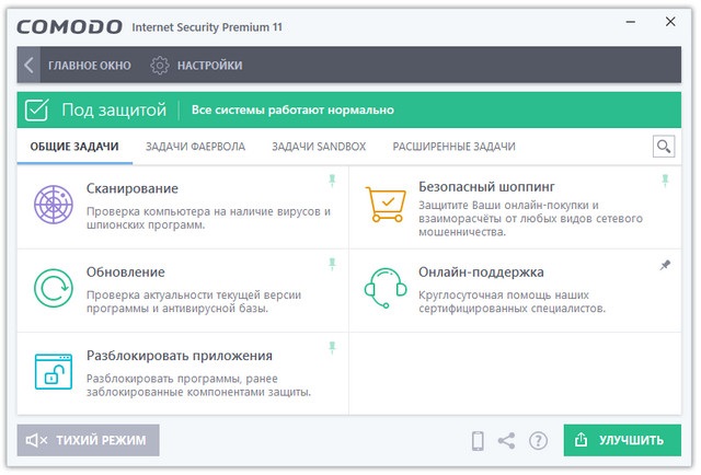 Comodo Internet Security - бесплатное комплексное решение безопасности. Включает антивирус и антишпион, фаервол с контент-фильтром, проактивную защиту HIPS, виртуальную среду - песочницу. Защищает от вирусов, интернет-атак и вредоносных веб-сайтов. Comodo Internet Security предлагает всестороннюю, комплексную защиту от внутренних и внешних угроз - новых и еще неизвестных. Решение сочетает мощный антивирус, эффективный фаервол с корпоративным уровнем фильтрации пакетов и модуль Comodo Защита+, включающий продвинутую систему поведенческой блокировки и предотвращения вторжений.