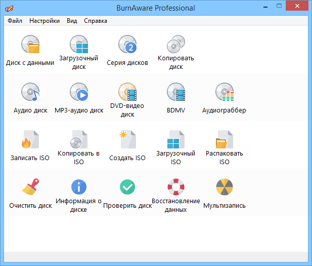 BurnAware Professional - компактная и простая в использовании программа для записи файлов на CD, DVD, Blu-Ray и HD-DVD диски. Поддерживает работу с любыми типами оптических дисков (включая CD-R/RW, DVD-R/RW, DVD+R/RW, BD-R/RE, HD-DVD-R/RW и DVD-RAM) и аппаратными устройствами записи. Есть возможность создания образов, записи мультисессионных дисков, проверки записанного содержимого.