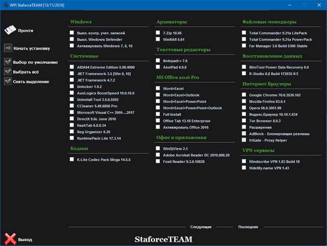 Сборник программ распределённых по категориям, с автоматической установкой на операционные системы Windows. Перед началом установки приложений необходимо отключить антивирусную программу.