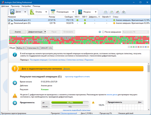 Auslogics Disk Defrag Pro - это профессиональная версия компактного и быстрого дефрагментатора, работающего как с FAT 16/32, так и с NTFS файловыми системами. Программа использует ряд алгоритмов, которые позволяют оптимизировать и упорядочить файлы Вашего жесткого диска, дефрагментировать файловую структуру и ускорить работу приложений и Windows.