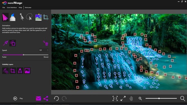 Corel PhotoMirage не требует видеозаписей, это анимация одного статического изображения «в три шага». Программное обеспечение предназначено для создания движущихся изображений «за считанные минуты», — позволяя пользователю выбирать скорость и направление движения с помощью стрелок. В отличие от синемаграфии здесь в качестве основы не используется видео. Все делается из одной фотографии. И здесь нет участия искусственного интеллекта. Программа просто «хватает» отдельные точки и переносит в другое место, смешивая с остальными.