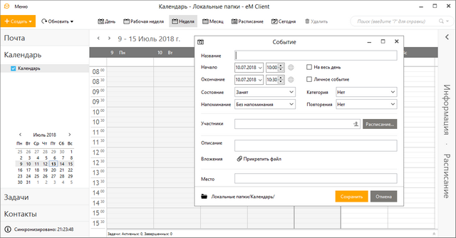 Программа eM Client представляет собой полнофункциональный клиент электронной почты с современным и простым в использовании интерфейсом. Она также предлагает календарь, задачник, контакты и чат. Поддерживает практически все почтовые серверы, а также позволяет импортировать имеющиеся данные из других популярных почтовых программ.