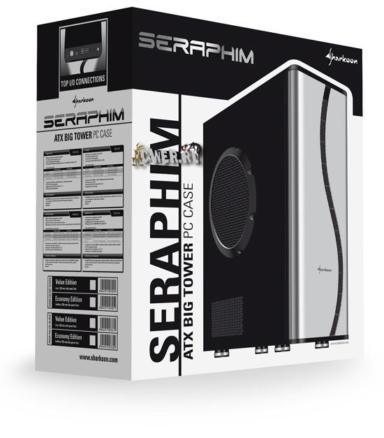 Корпус с габаритами 215 x 535 x 540 мм предлагается в двух модификациях, из которых Sharkoon Seraphim Economy Edition стоимостью 89 евро поставляется без предустановленных вентиляторов, а Sharkoon Seraphim Value Edition по цене 99 евро комплектуется одним 140-миллиметровым фронтальным и одним 250-миллиметровым боковым кулерами. В обоих случаях реализована возможность дополнительного использования двух 80-миллиметровых боковых и одного 140-миллиметрового тылового "пропеллеров".