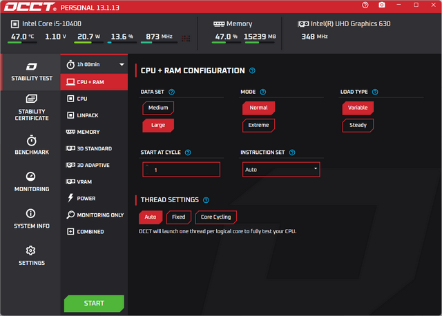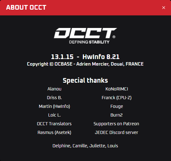 OCCT (OverClock Checking Tool) - тест стабильности системы, который представляет собой более красочный аналог известного Prime с возможностью проверки подсистемы памяти и отдельно процессора с функциями мониторинга и выводе детальных графиков по всем контролируемым пунктам. Считывание показателей материнских плат и процессоров обеспечивается за счет взаимодействия с известными программными решениями подобного класса, а именно MotherBoard Monitor, SpeedFan и Lavalys Everest.