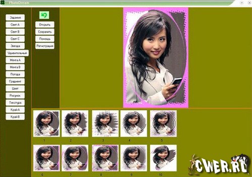 PhotoDream v1.7 - фоторедактор, позволяющий добавить на фотографии разнообразные эффекты, общее количество которых 150 (15 блоков по 10 эффектов). Можно применить один или несколько фильтров на одну фотографию. Программа очень проста в управление и не требует абсолютно никаких навыков в работе.