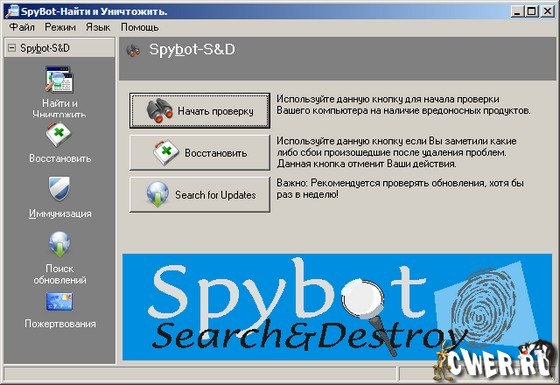 Spybot - Search & Destroy (Спайбот - найти и уничтожить) может обнаруживать и удалять с Вашего компьютера различного рода шпионское программное обеспечение. Шпионское ПО (Spyware) - относительно новый вид угрозы, который еще недостаточно широко обрабатывается стандартными антивирусами. Шпионское ПО молча отслеживает ваше поведение за компьютером, чтобы создать ваш "маркетинговый профиль", который так же молча передается сборщикам информации, продающим ваши данные рекламным организациям. Если Вы видите в Вашем браузере новые панели инструментов, которые Вы явно не устанавливали, если браузер постоянно "падает" или стартовая страница неожиданно изменилась, то вполне вероятно, что в Вашем компьютере завелся "шпион". Но даже если нет ничего необычного, то "шпионы" все равно могут быть - чем дальше, тем больше появляется такого ПО.