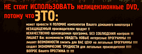 "Поломка компонентов" - самая, пожалуй страшная угроза (и картинка соответствующая). Мы вместе с ближайшими знакомыми ("первого порядка", т.е. личный контакт) владеем суммарно полутысячей пиратских дисков. Ни одной поломки. Если добавить что я ни разу не слышал о случаях поломки у РЕАЛЬНЫХ людей (общих знакомых и пр., "второго порядка") - цифра увеличится до тысячи. Сэкономлено 1000*(25-5)=20000$ (25 - стоимость "лицензии", 5 - стоимость по которой мы берём диски). Это - 100 DVD-плееров! Даже если каждый тысячный диск будет ПОЛНОСТЬЮ ломать плеер можно вместо каждого сломанного покупать десяток новых и ещё останется на приличную новую иномарку (в смысле - автомобиль). Возможно "кое-где у нас порой" у кого-то что-то и ломалось. Но такие же слухи я читал и о лицензионных дисках, в частности об "Игре". Поскольку делаются все диски на одинаковых линиях, вероятность поломки, очевидно, одинаковая.