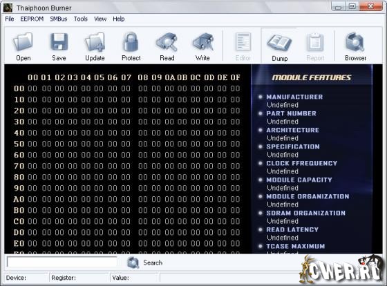 Thaiphoon Burner - программа от белорусского разработчика, которая предусматривает непосредственную работу с областью SPD модуля памяти, содержащей параметры его функционирования. В частности, программа осуществляет считывание всех 256 ячеек SPD и последующую дешифрацию их значений с непосредственным выводом в детальный отчет. Присутствует возможность как полной перезаписи SPD данными, загруженными из сторонних файл-дампов, так и запись отдельных ячеек. В программе реализован специальный режим эмуляции, при котором игнорируется непосредственная перезапись ячейки, но результат изменения можно проанализировать в отчете, сохранив тем самым целостность SPD. Программа также располагает функцией поиска всех устройств, подключенных к шине System Management Bus – датчики мониторинга, тактовые генераторы, дубликаты SPD и т.д. Программа полностью совместима с SDRAM, DDR, DDR-II, DDR-3, Intel Extreme Memory Profiles.