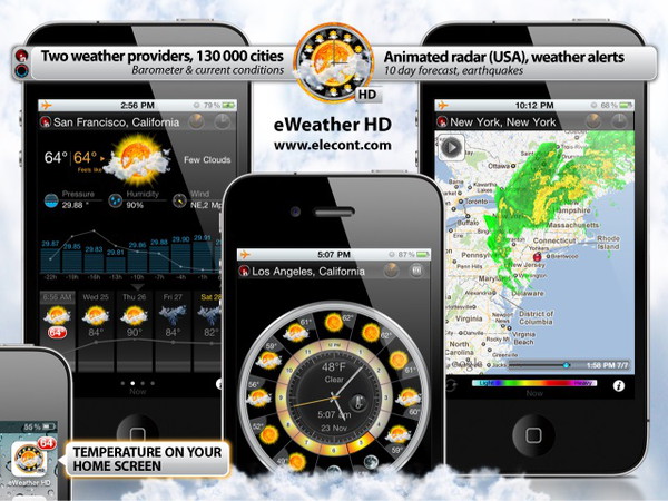 eWeather HD - это приложение, которое предоставляет точный и детальный прогноз погоды по всему миру. Для удобства просмотра информации в программе имеются собственные виджеты. Причем данные, которые будут показаны в виджете, вы можете указать самостоятельно. Например, приложение может выводить на виджет текущую погоду и прогноз на несколько ближайших дней или же показывать информацию о погодных условиях сразу в нескольких населенных пунктах. Стоит отметить, кстати, что программа довольно тесно работает со службами геолокации и может автоматически переключать населенные пункты на главном экран в соответствии с вашими перемещениями.