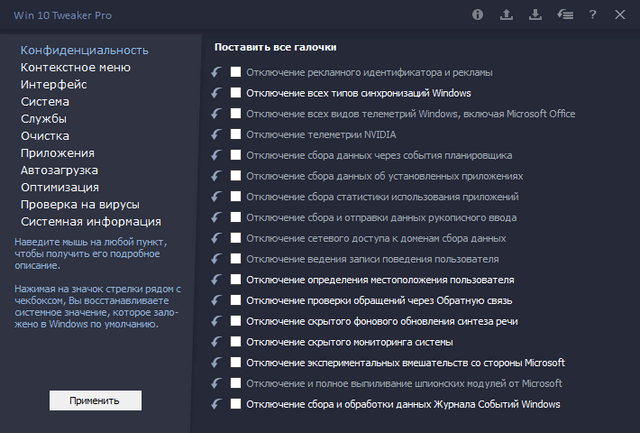 Win 10 Tweaker — небольшая и очень функциональная программа для Windows 7, Windows 8.1, Windows 10, позволяющая в два клика отключить все типы слежения Windows за пользователем, очистить систему, настроить контекстное меню, интерфейс, оптимизировать автозагрузку и систему. Каждый пункт содержит подробную подсказку-описание. Любое действие выполняется без внешних модулей — средствами только самой программы.