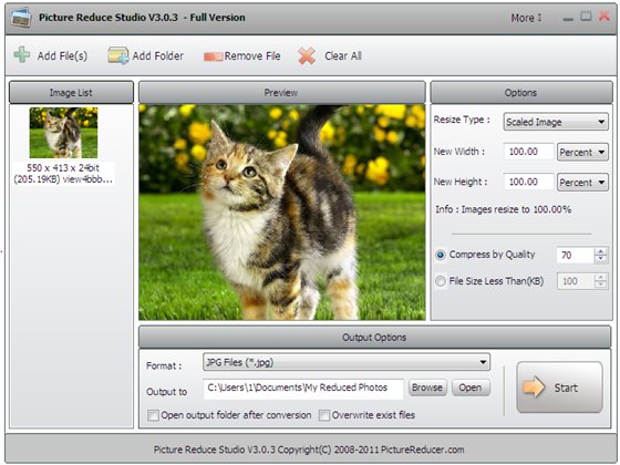 Picture Reduce Studio программа которая представляет из себя отличное средство для работы с графическими файлами, а если быть точнее, вы сможете изменять размер ваших изображений, конечно же стоит сразу отметить, что присутствует пакетный режим, таким образом вы сможете сильно сэкономить свое время. Программа имеет простой интерфейс, Русской поддержки нет. Стоит отметить, что утилита умеет изменять размер разными методами, в частности либо путем сжатия, либо другими вариантами. Для каждого изображения, программа позволяет подобрать индивидуальный вариант изменения размера, умеет работать с форматами PNG, GIF, BMP и другими.