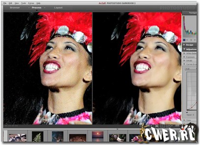PhotoStudio Darkroom работает с изображениями RAW, JPEG и TIFF форматов и имеет широкие возможности экспорта. В программе имеется встроенный фотобраузер, возможность импорта фотографий непосредственно в редактор с цифровой камеры или съемного диска. Программа поддерживает работу с RAW форматом цифровых камер следующих производителей: Canon, Nikon, Panasonic, Sony, Kodak, Olympus, Sigma, Mamiya, Epson. Более подробный модельный ряд поддерживаемых цифровых камер смотрите на сайте разработчика. В PhotoStudio Darkroom интегрированы функции автоматического удаления эффекта "красных глаз", так же присутствует инструмент для удаления и сглаживания царапин и другие полезные возможности, благодаря которым пользователь может быстро улучшить качество фотографии.