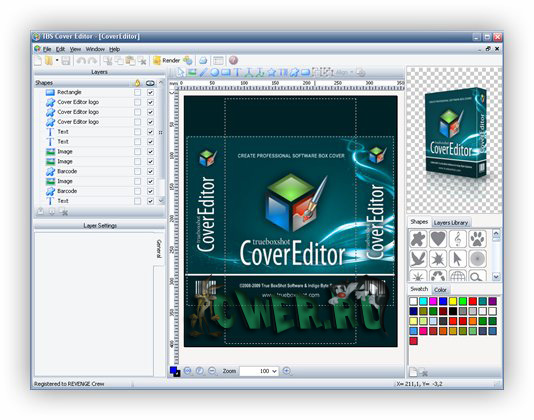 TBS Cover Editor - многофункциональная программа для создания и редактирования обложек и 3D коробок для ваших продуктов. Отличительной особенностью этой программы является возможность представления коробки во время редактирования в качестве развёртки её всех сторон одновременно с отображением её готового трехмерного вида, мгновенно меняющегося согласно сделанным изменениям в обложке коробки. Каждый объект на обложке создается в качестве отдельного слоя и вы даже сможете применять к нему различные эффекты, такие как внешняя и внутренняя подсветка, наложение тени от объекта, градиенты и т.д. Ещё одно не мало важное достоинство редактора - это базово заложенный богатый набор шаблонов вида коробок. Помощник программы после выбора вами понравившегося шаблона и ввода имени продукта и фирмы, пошагово доведет вас до конечного результата. В отличие от других аналогичных программ, рендеринг результата проходит очень быстро и вы сможете сохранить результат в один из графических форматов.