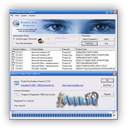 Product Key Explorer - позволяет расшифровать и увидеть, а также сохранить серийные номера (Product ID, Product Key, License Info, User Name, Company) продуктов Microsoft, CD-key установленных на компьютере программ, и не только их. Неполный список ПО, регистрационные данные которых можно увидеть и сохранить: Micrsoft Windows (2000, XP, 2003, Vista), Microsoft Office 2003, Microsoft Office 2007, Microsoft Office XP, Micrsoft Visual Studio 2005, Macromedia, Ahead Nero, Adobe Photoshop, CyberLink PowerDVD, Borland Delphi и т.д.