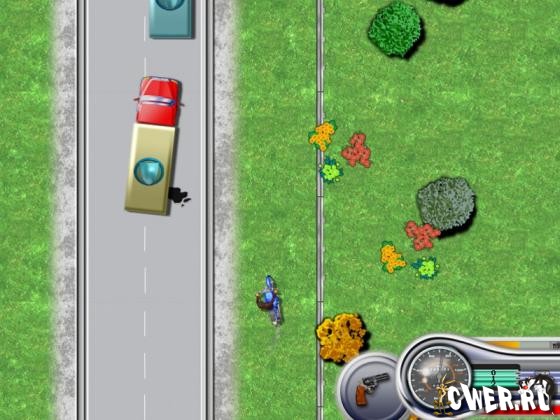 Теперь в твоем распоряжении крутой мотоцикл и мощная пушка у тебя за поясом. Жми на газ и покажи им, на что ты способен. Не забудь, что у тебя на хвосте копы, и придется отстреливаться. Будь предельно внимателен, нужно проявить все свое мастерство. Подбирай с обочины дороги призы. Подорви вражеские тачки и заработаешь бонусные очки.