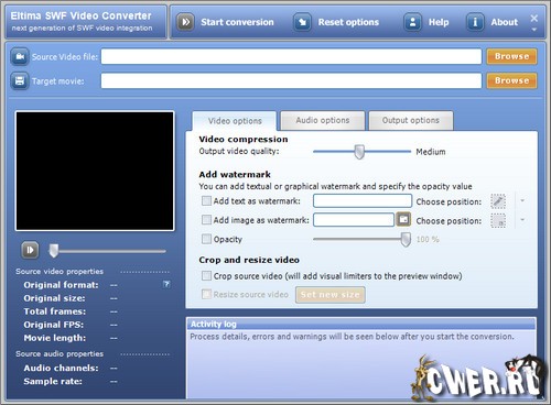 Copyright protect your SWFs by adding watermarks to your resulting movies, choose any opacity and position for them on the screen. Add video and sound movie controls to make watching the Flash movie more comfortable. Make your movies more captivating by removing unwanted areas or cropping unneeded areas in the movie. SWF Video Converter will easily do this for you.