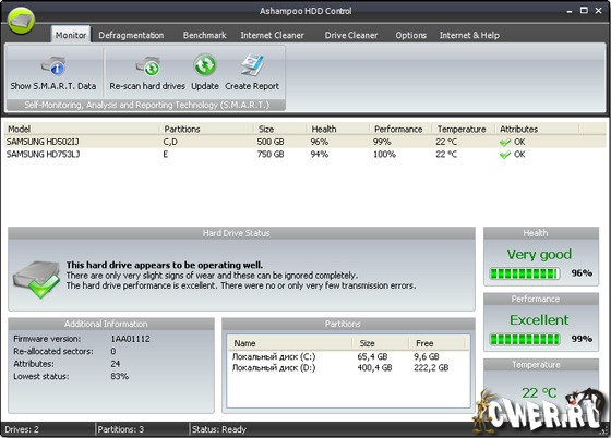 Ashampoo HDD Control программное обеспечение для контроля за состоянием Вашего жесткого диска. Выполняет обслуживание жесткого диска для Вас. Позволяет предотвратить потенциальные отказы и аварии прежде, чем они произойдут. Программное обеспечение поддерживает жёсткие диски типа IDE и последовательные ATA. Ashampoo HDD Control предоставляет пользователю все важные факты и информацию о дисководе, включая регистрационный номер, версию БИОСА (прошивки), размер кэша, количество разделов, на которые разбит хард, свободном месте на диске и текущей температуре.