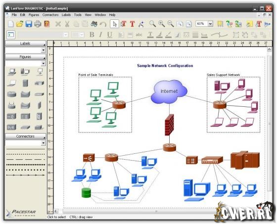 LanFlow - это редактор диаграмм в первую очередь ориентированный на проектирование / презентацию локальных сетей. Расставьте компоненты, подобные компьютерам, рабочим станциям, маршрутизаторам и серверам, и соедините их линиями и кабелями. Выбирайте компоненты из встроенных символов и рисунков или добавляйте картинки общедоступных форматов. Используйте линии для соединения ваших компонентов и добавьте черточки, дуги, стрелки или их комбинации для требуемого вида. Введите текст описания, где хотите, используя сетку, которая поможет вам сохранить симметричность и расположение. Содержит такие возможности, как полное увеличение, OLE подключаемость для добавления ваших диаграмм в другие документы, печать плакатов, импорт графики и экспорт в web страницы, автоматическую маршрутизацию, символы потоков и т.д. Включает простые контурные компоненты и набор 3D символов сетевого окружения, аналогичный стандартному набору в книгах и документации Cisco.