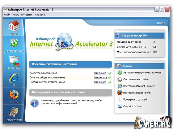 Ashampoo Internet Accelerator - программы для оптимизации соединений с Интернетом. Программа имеет красивый и в тоже время удобный интерфейс, который поможет быстро и легко настроить все сетевые параметры. Тут присутствует возможность оптимизировать соединения, как в автоматическом режиме, так и вручную, а также можно сбросить все настройки Интернет-соединений на значения, установленные в ОС Windows первоначально.