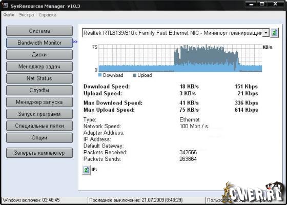 - Наблюдает за шириной канала сети и трафиком (поддержка всех типов сети: Internet(ADSL)/Ethernet/беспроводные сети).