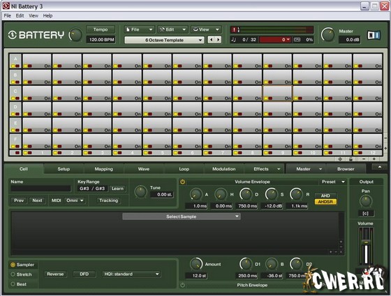 Изюминкой Battery 3 стала матрица, размерность которой может быть изменена пользователем в зависимости от кол-ва загружаемых семплов (до 128 ячеек). Благодаря цветовому кодированию ячеек, возможности множественного выбора, настройке рядов и столбцов матрицы, пользователю стало еще быстрее и удобнее работать с содержимым и параметрами ячеек.